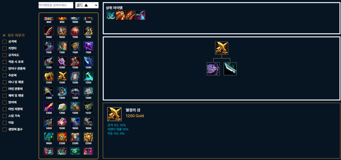 - 특정 아이템을 선택하면 상세 정보, 상위 아이템, 하위 아이템을 확인할 수 있다.